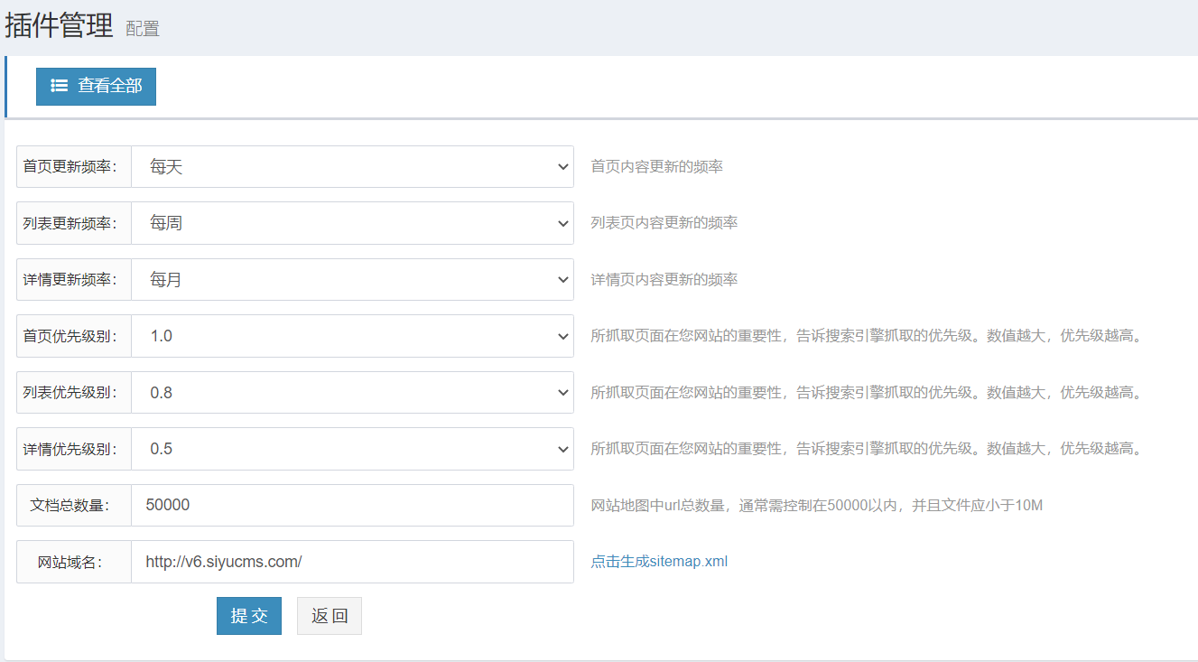 1、配置提示權(quán)限不足請(qǐng)修改addons/sitemap目錄可寫權(quán)限